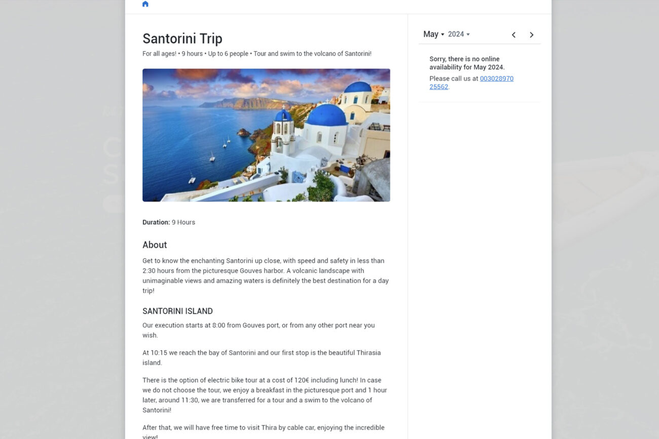 Παρέχει τη δυνατότητα στον επισκέπτη της ιστοσελίδας να διευκολύνει την διαδικασία της κράτησης για την επιθυμητή εκδρομή του, με μόλις λίγα κλικ. Με αυτόν τον τρόπο, ο χρήστης μπορεί να εξοικονομήσει χρόνο και κόπο, καθώς μπορεί να ολοκληρώσει την κράτησή του γρήγορα και εύκολα. Με αυτήν την προνοητική λειτουργία, η ιστοσελίδα προσφέρει στον χρήστη μια απρόσκοπτη και ομαλή εμπειρία κράτησης, προσφέροντας του ένα υψηλό επίπεδο εξυπηρέτησης και άνεσης.